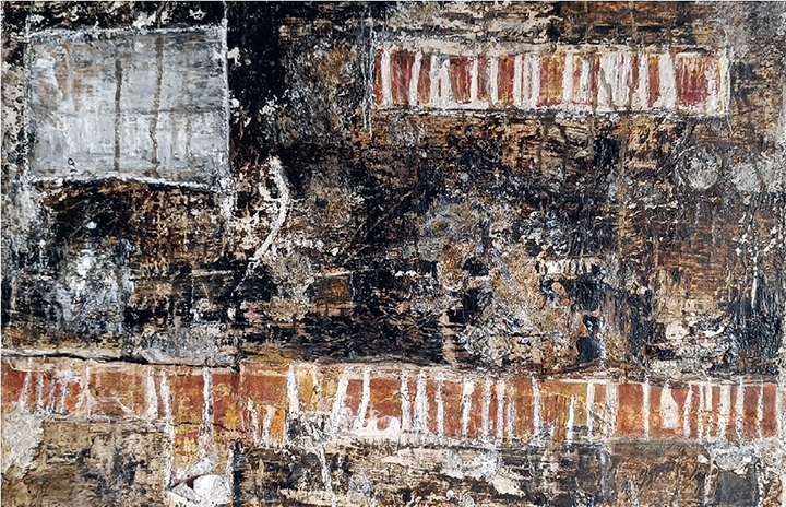 Die Collagen von Ulrike Ankirchner lassen sich als tiefgründige Materialbilder beschreiben. Besonders das Einfügen von Briefen, Dokumenten und Fundstücken in Verarbeitung mit Gips, Kreide oder Wachs schafft sinnliche Bildflächen und bietet den Betrachter*innen eine plastische Landschaft, die sie fantasievoll durchwandern können.